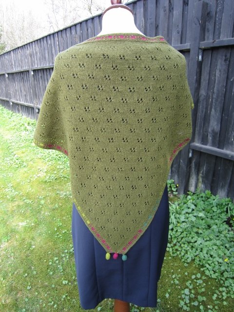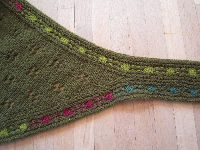 Kanterne på sjalet er strikket i vævestrik, mens der på selve sjalet er [...]et lille hulmønster.
