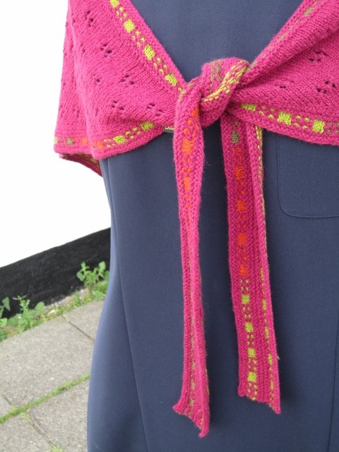 Sjalet er strikket med nogle smalle bånd/kanter, der gør det anvendeligt [...]som både sjal og tørklæde.